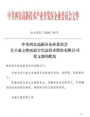 在中國共產(chǎn)黨建黨九十九周年之際,公司收到了中共西安高新區(qū)企業(yè)委員會“關(guān)于成立陜西思宇信息技術(shù)股份有限公司黨支部的批復(fù)”文件,這標(biāo)志著公司黨組織的正式建立。