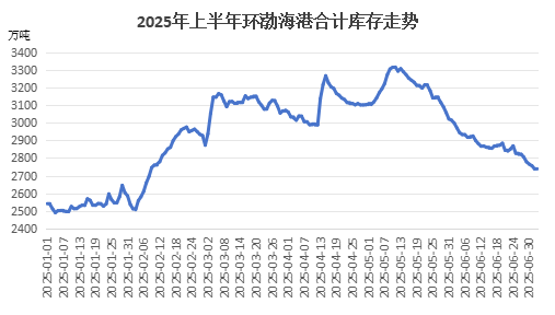上半年由于煤炭供需關(guān)系持續(xù)寬松,煤價不斷下行,跌幅均值在20%以上。產(chǎn)量方面,2025年上半年國內(nèi)原煤產(chǎn)量整體保持同比增長趨勢,據(jù)國家統(tǒng)計(jì)局?jǐn)?shù)據(jù),1-5月全國原煤產(chǎn)量達(dá)到19.9億噸,同比增長6%;庫存方面,上半年北方港口煤炭庫存整體持續(xù)處于歷史偏高水平,持續(xù)累庫至5月月中創(chuàng)歷史最高水平后回落,截至6月30日環(huán)渤海港合計(jì)煤炭庫存在2765.4萬噸,較年初累計(jì)增加224.4萬噸,增幅在8.83%。